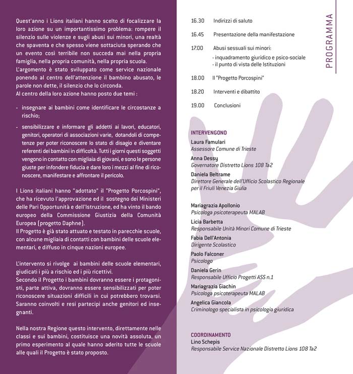 Manifesto creato per l’incontro presso la Camera di Commercio di Trieste a tema “Abusi sessuali sui minori”, tenutosi il 19 giugno 2014.