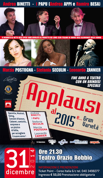Manifesto pubblicitario per lo spettacolo di varietà “Applausi”tenutosi il 31 dicembre 2014 presso il teatro Orazio Bobbio di Trieste.