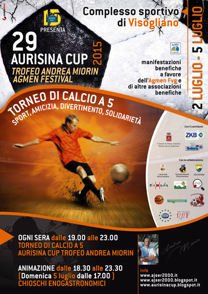 Manifesto pubblicitario per il ventinovesimo torneo di calcio a 5 “Aurisina Cup”, tenutosi a Visogliano dal 2 al 5 luglio 2015. La manifestazione ha scopo solidale e favorisce associazioni benefiche tra le quali vi è Agmen FVG.