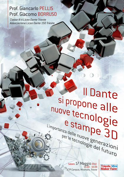 Manifesto per “Il Dante si propone alle nuove tecnologie 3D”; giornata presentata dal professor G.Pellis e dal professor G.Perruso presso ICTP Campus Miramare, Trieste, nella giornata di sabato 17 maggio 2014.