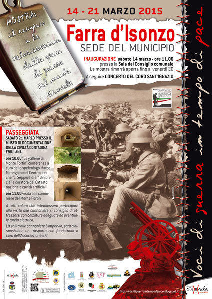 Manifesto della mostra “Farra d’Isonzo”, esposizione presente dal 14 al 20 marzo 2015 presso la sala del Consiglio comunale nell’ambito del progetto “Voci di guerra in tempo di pace”