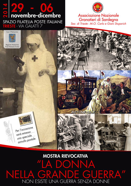 Manifesto per la mostra rievocativa “La Donna nella Grande Guerra” presso lo spazio filatelia Poste Italiane in via Gaiatti 7, Trieste, dal 29 novembre al 6 dicembre 2014.