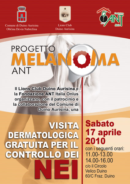 Volantino pubblicitario per la visita gratuita dei nei organizzata da il Lions Club di Duino – Aurisina e l’ANT Italia Onlus con il patrocinio e la collaborazione del comune di Duino – Aurisina in data 17 Aprile 2010, con il nome di “Progetto Melanoma”.