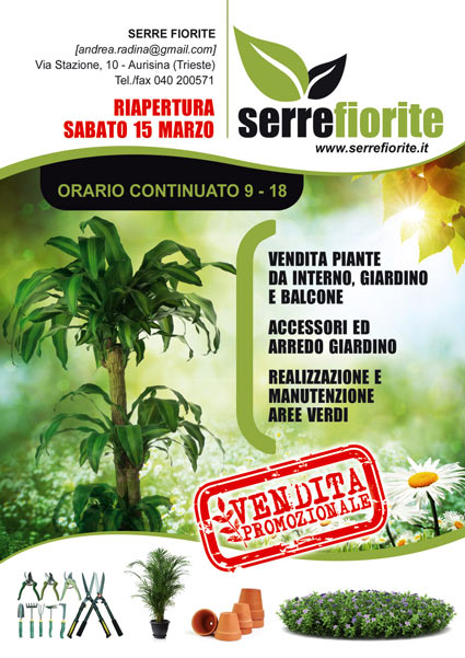 Volantino in formato A5 per pubblicizzare la riapertura del negozio “Serre Fiorite”, sito a Duino, in provincia di Trieste.
